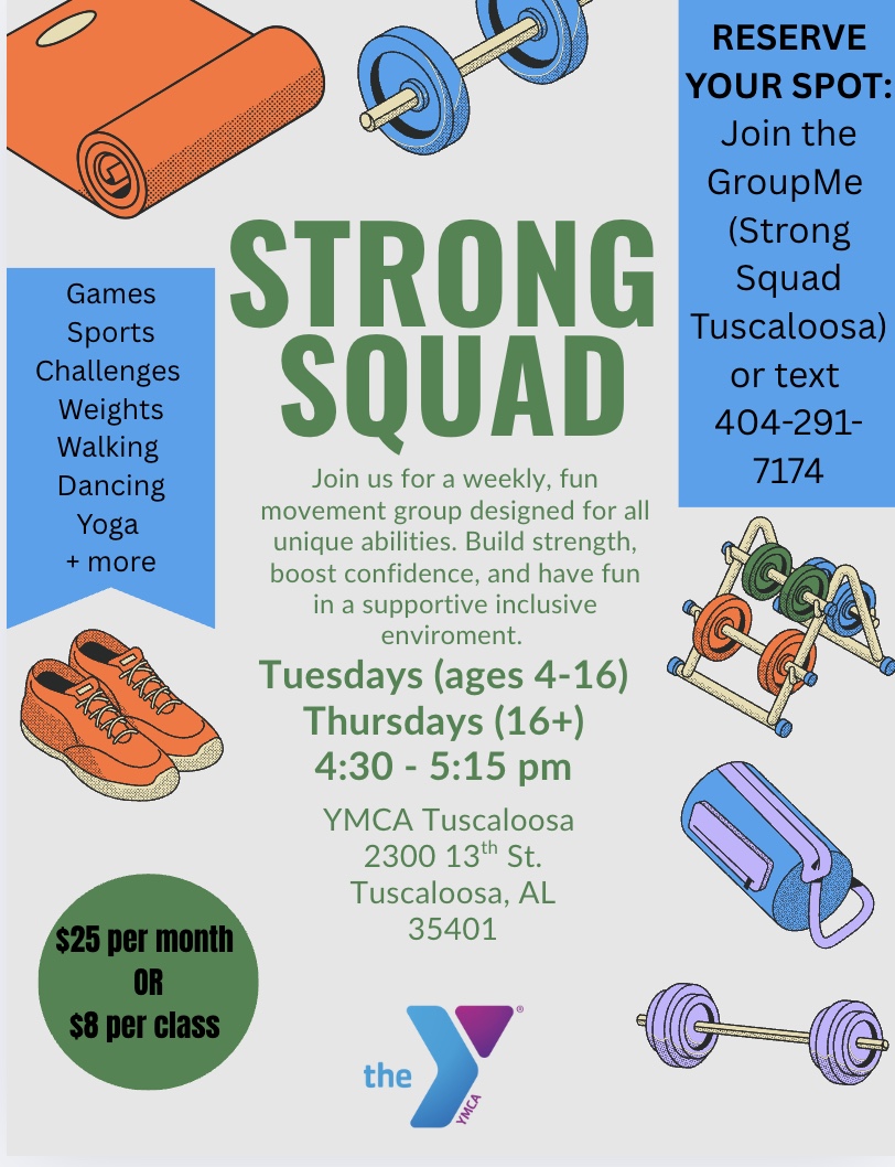 A weekly adaptive movement class on Tuesday and Thursday afternoons for those with disabilities (intellectual / developmental disabilities, autism disorders, cerebral palsy, down syndrome, and other. Class will have a range of activities each week, from dancing, sports, and games to challenges, obstacle courses, and yoga. We accommodate all ages by hosting two separate classes. Ages 4-16 on Tuesday's at 4:30 and ages 16+ on Thursday's at 4:30. The class takes place at The YMCA of Tuscaloosa and the cost is $25 monthly (4 classes) or $8 per class. To reserve your spot, text 404-291-7174 or join the GroupMe (Strong Squad Tuscaloosa)