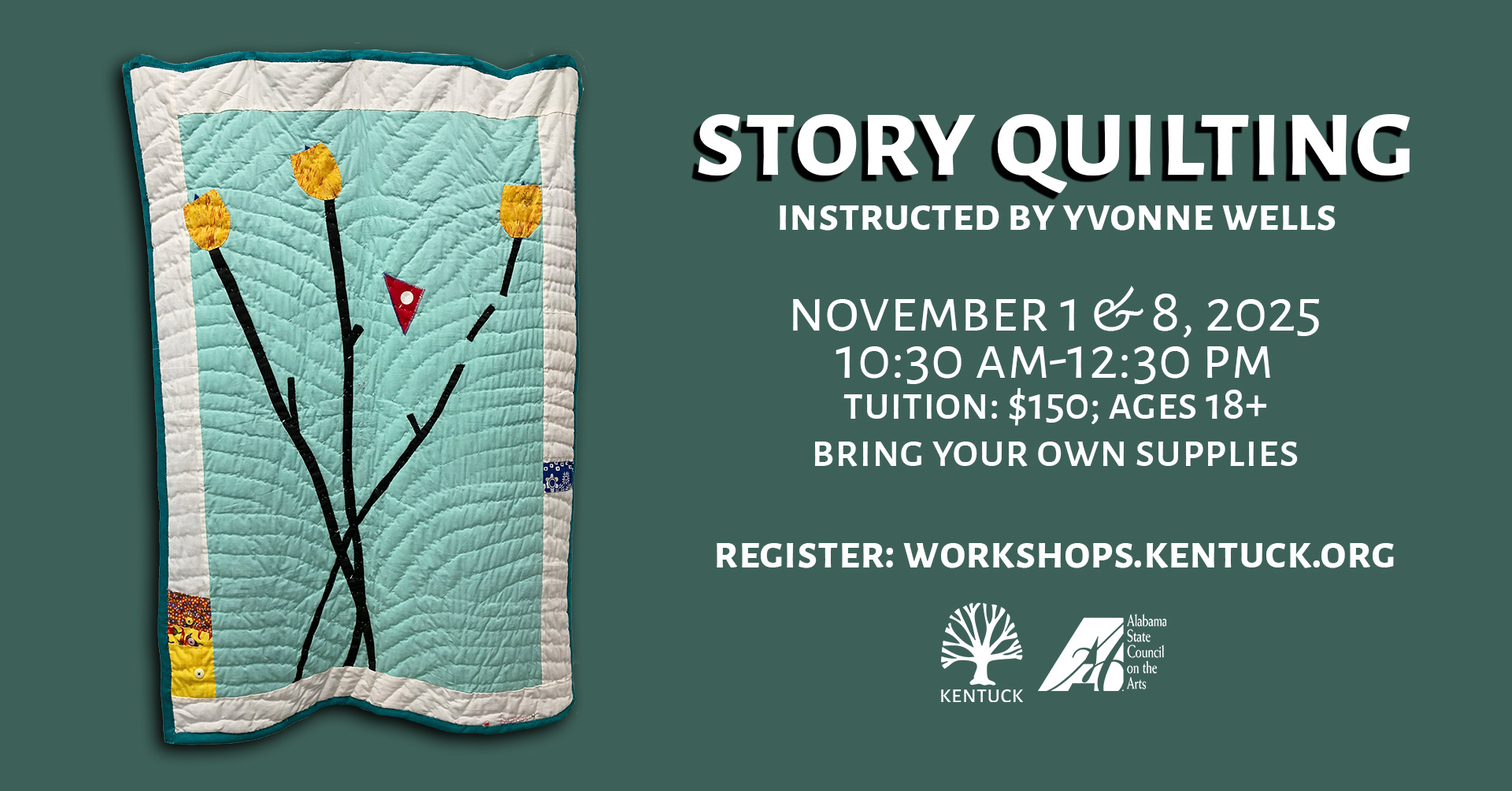 Join Yvonne Wells to learn her process of telling a story through quilting! In this two-day workshop, Yvonne will share her artistic journey and process with participants. Then, participants will create their own small story quilt. This workshop will focus on hand sewing and will not use machines. Participants will need to bring all supplies and to come with a story they’d like to depict in mind.